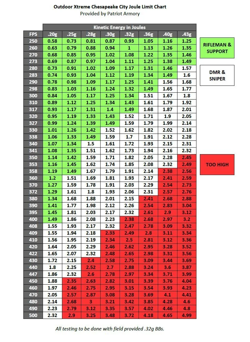 ◦ All Replicas within this class will be chronoed with .32g BB’s provided by the field and cannot exceed 395 FPS w/ .32g BBs (2.32 Joules).